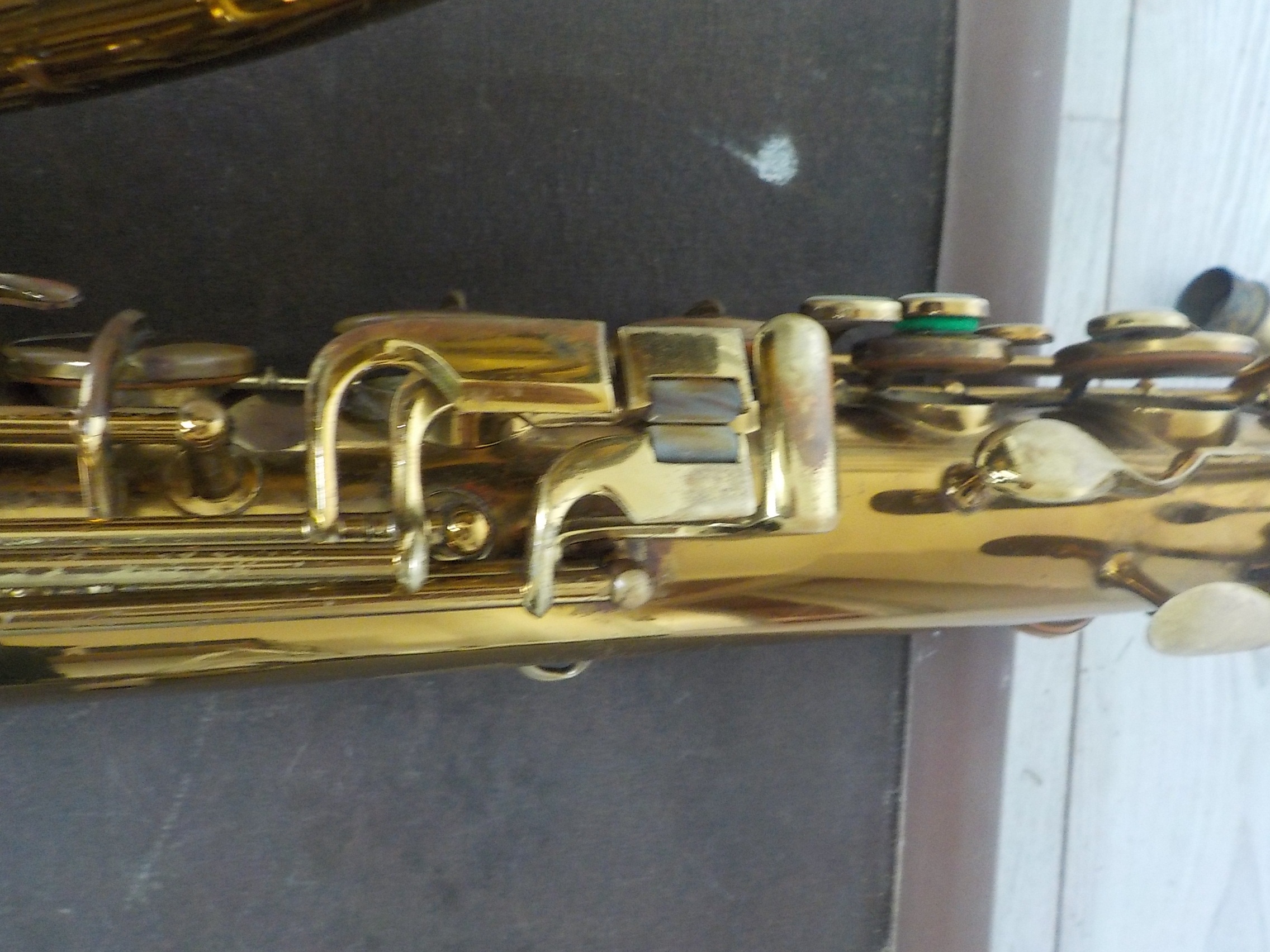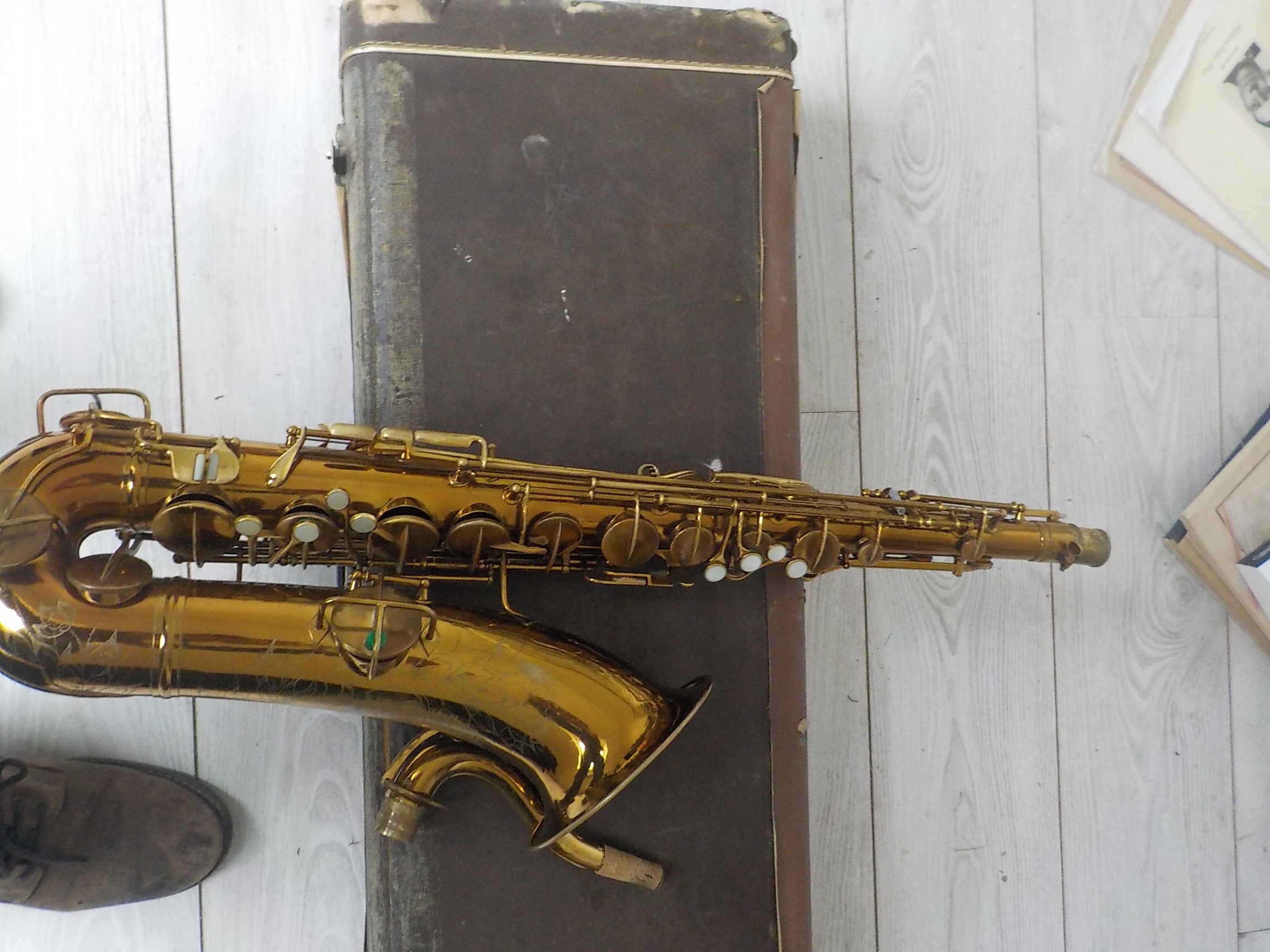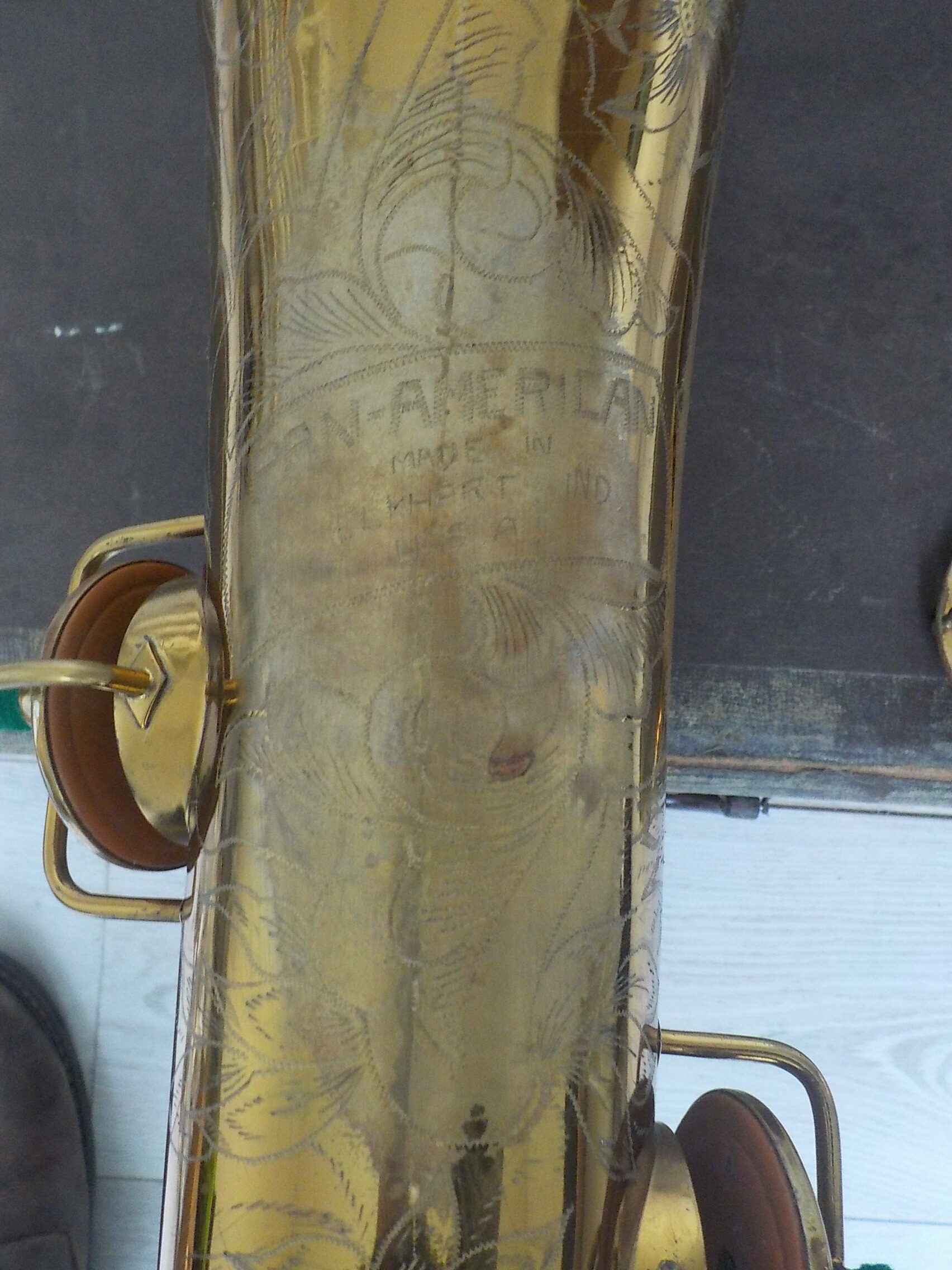 saxophone ténor pan american fabriqué par conn dans les années 30 aux usa.les tampons ne sont pas neufs mais en bon état.beau vernirs noir-doré.règlé,fonctionne bien.vieil étui solide